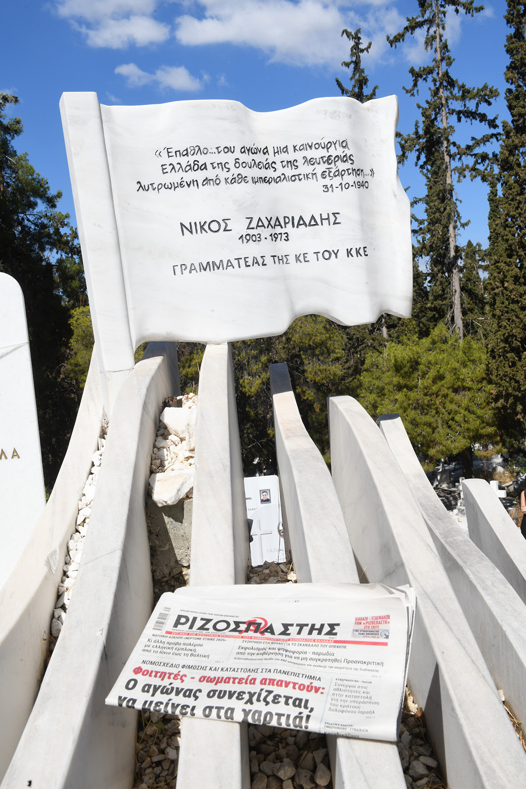 «Βρισκόμαστε σήμερα εδώ στο Α’ νεκροταφείο, εδώ που έγινε η τελευταία κατοικία του Νίκου Ζαχαριάδη με τον επαναπατρισμό της σορού του τον Δεκέμβρη του 1991, με ευθύνη του ΚΚΕ.