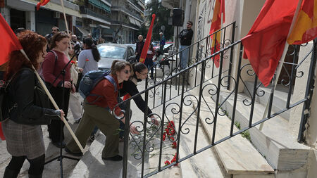 Το σπίτι στην οδό Δουκίσσης Πλακεντίας 3, στους Αμπελόκηπους υποδεχόταν σήμερα την εκδήλωση με φροντισμένο τον εξωτερικό του χώρο το οποίο κοσμεί το σήμα της ΕΠΟΝ, ένα απόσπασμα από τον ύμνο της και την ημερομηνία ίδρυσής της, σε μία κίνηση αποτύπωσης του ιστορικού του χαρακτήρα από την ΚΝΕ.